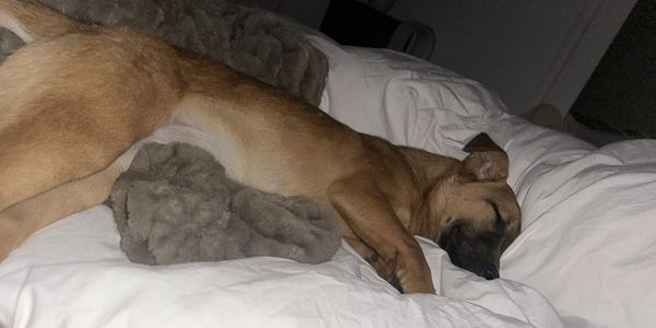 Cannoli enjoying her time on a very comfortable bed! A big change from the cold nights in the streets of Tijuana!